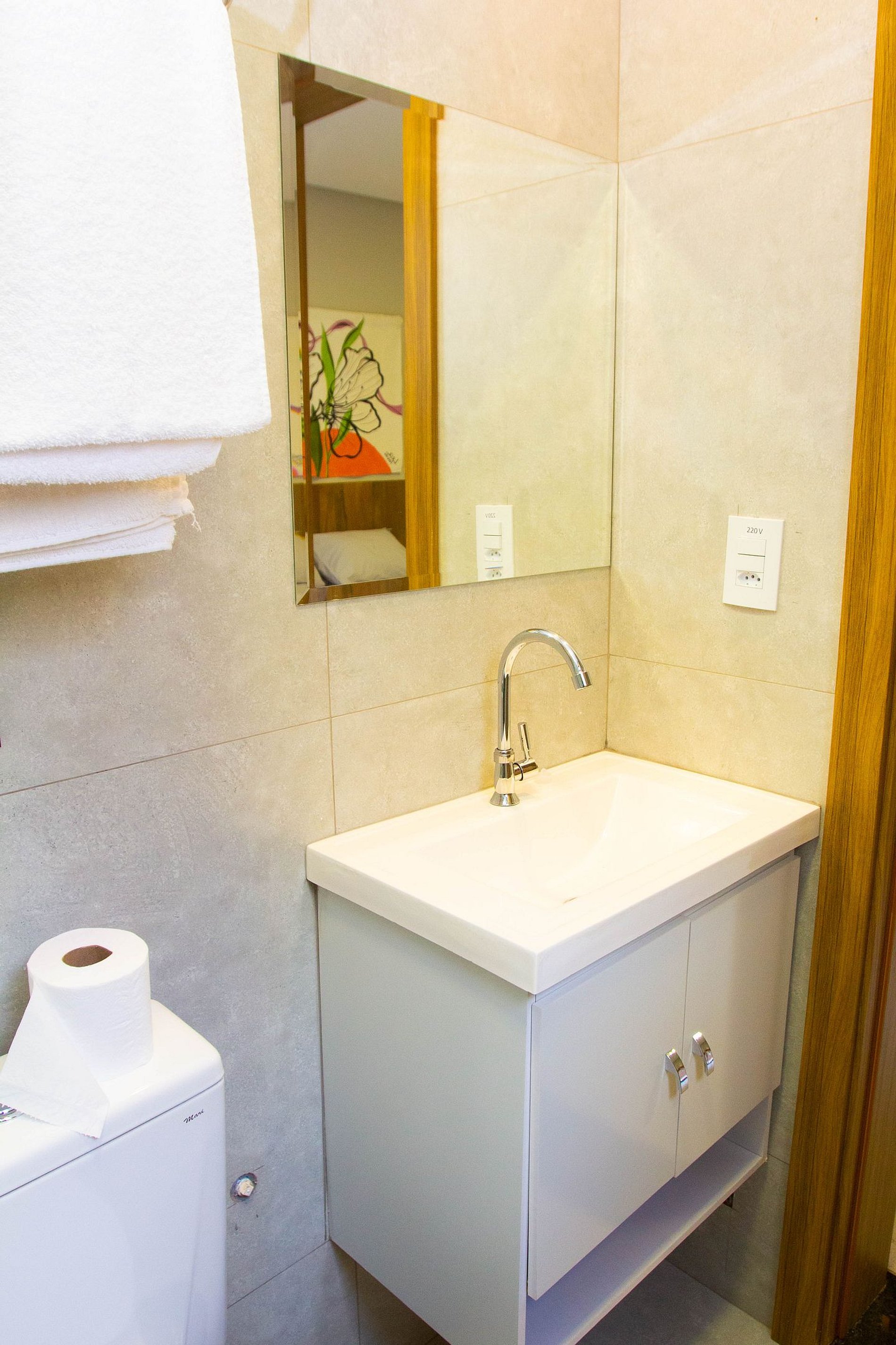 A suíte conta com uma cama queen size e uma cama de solteiro, frigobar, ar condicionado, smartTV. Disponibilizamos sabonetes, roupas de cama e banho por cortesia. O espaço é monitorado 24h por câmeras de segurança (áreas comuns) e Wi-fi.