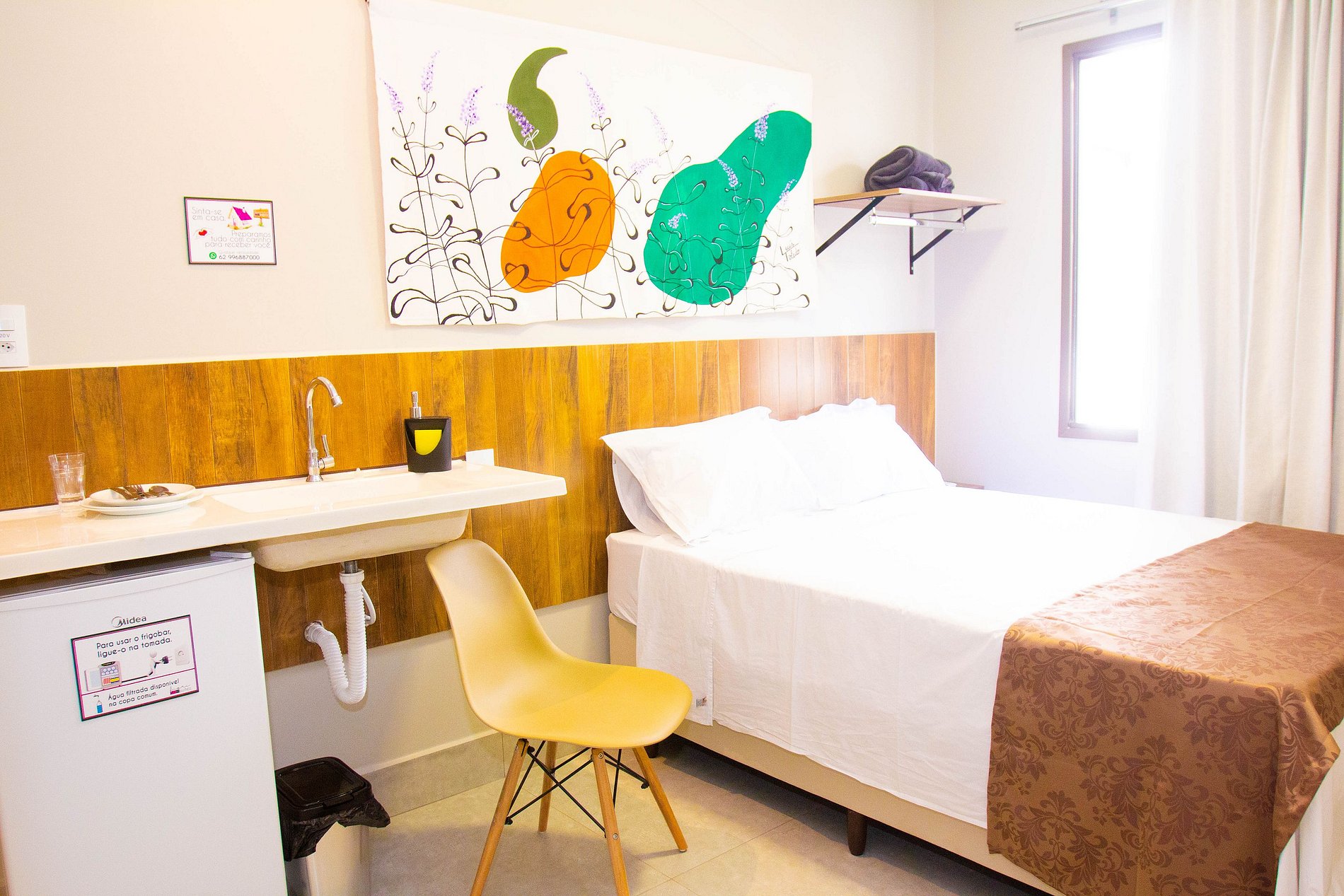 A suíte conta com uma cama de casal, frigobar, ar condicionado, smartTV. Disponibilizamos sabonetes, roupas de cama e banho por cortesia. O espaço é monitorado 24h por câmeras de segurança (áreas comuns) e Wi-fi.