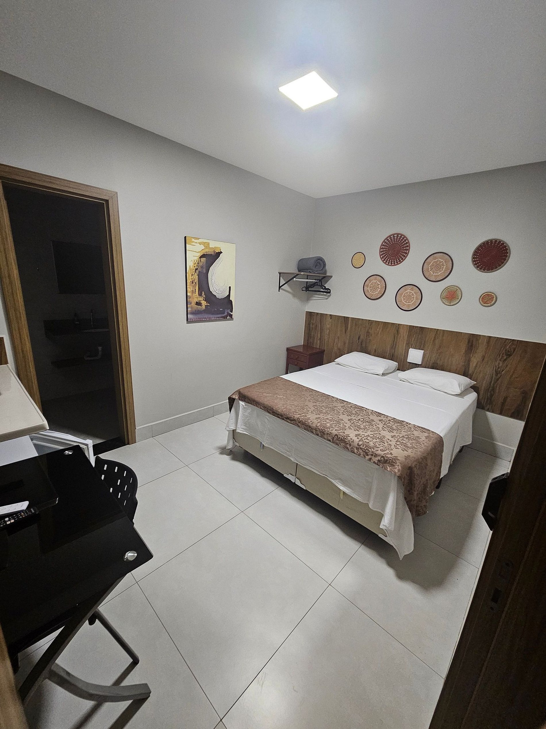 A suíte conta com uma cama de casal, frigobar, ar condicionado, smartTV. Disponibilizamos sabonetes, roupas de cama e banho por cortesia. O espaço é monitorado 24h por câmeras de segurança (áreas comuns) e Wi-fi.
