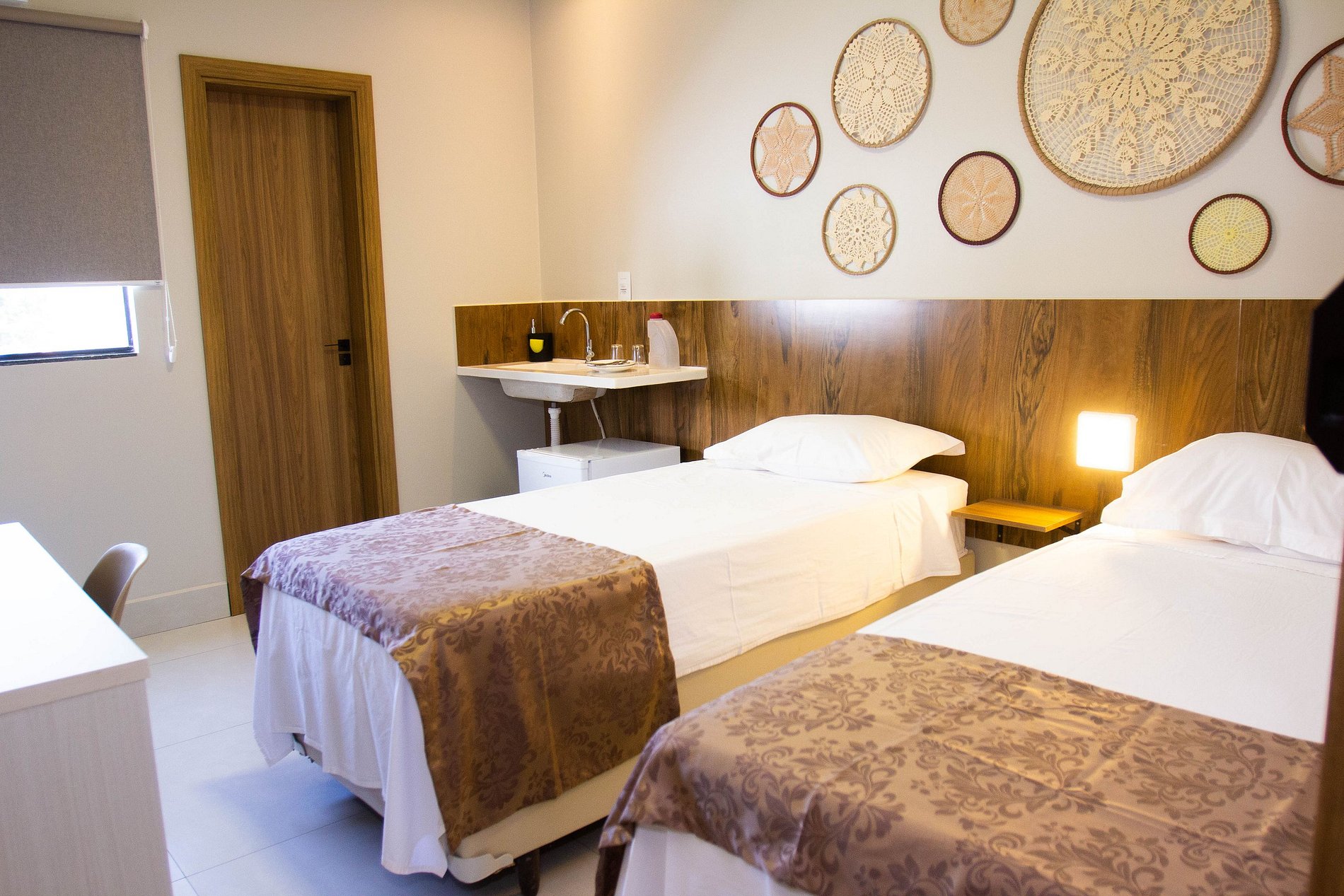 A suíte conta com duas camas de solteiro, frigobar, ar condicionado, smartTV. Disponibilizamos sabonetes, roupas de cama e banho por cortesia. O espaço é monitorado 24h por câmeras de segurança (áreas comuns) e Wi-fi.