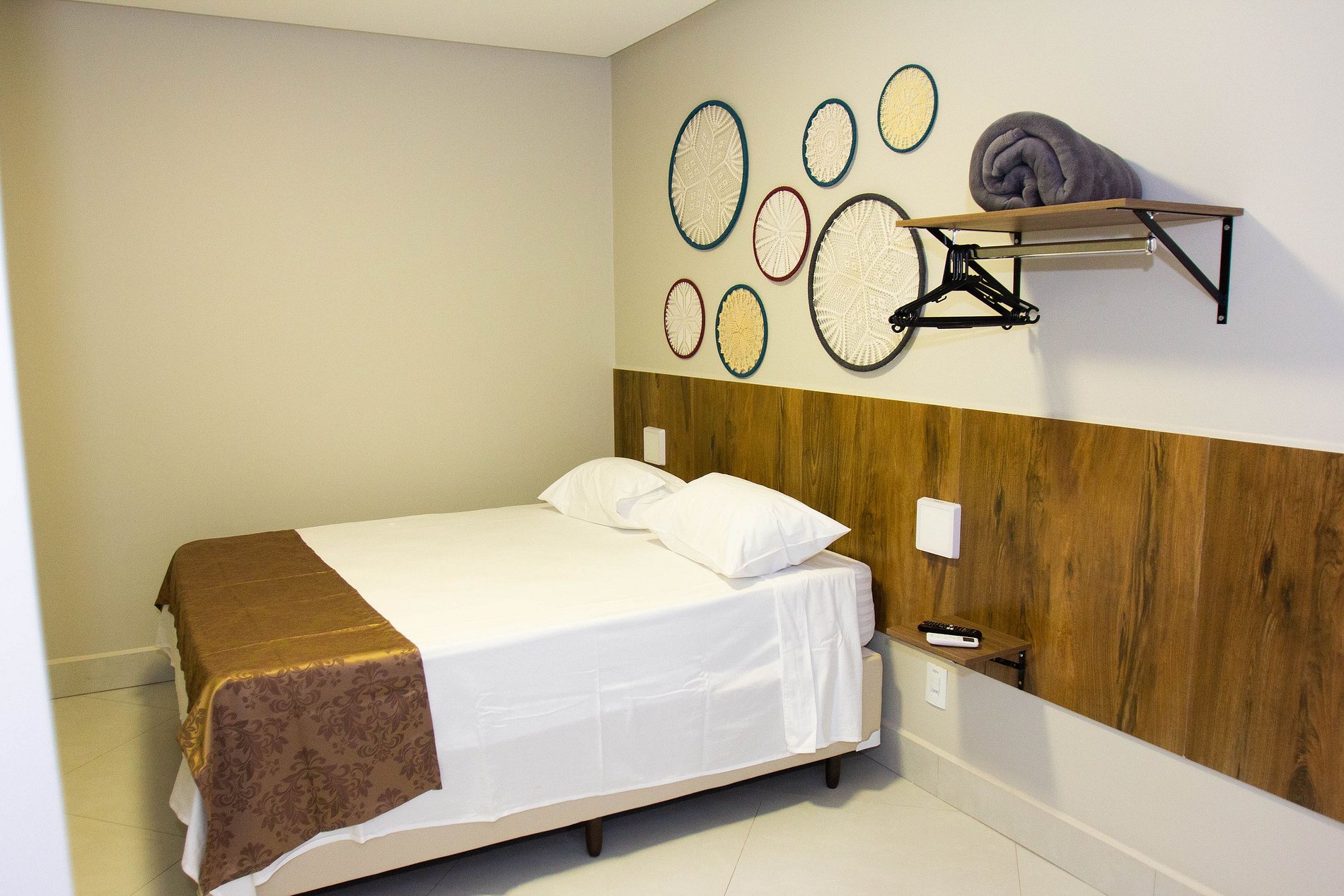 A suíte conta com uma cama queen size, frigobar, ar condicionado, smartTV. Disponibilizamos sabonetes, roupas de cama e banho por cortesia. O espaço é monitorado 24h por câmeras de segurança (áreas comuns) e Wi-fi.
