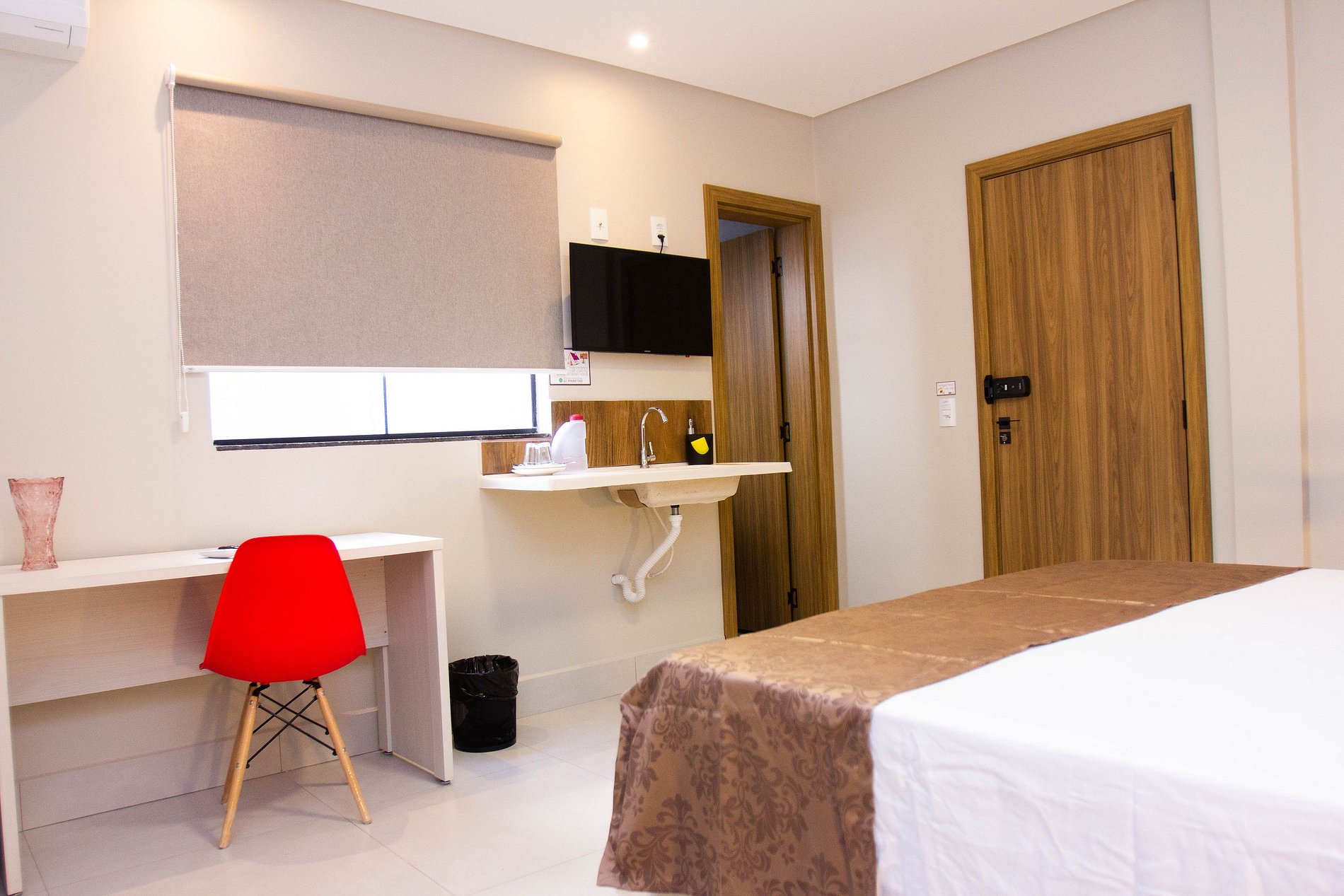 A suíte conta com uma cama queen size, frigobar, ar condicionado, smartTV. Disponibilizamos sabonetes, roupas de cama e banho por cortesia. O espaço é monitorado 24h por câmeras de segurança (áreas comuns) e Wi-fi.