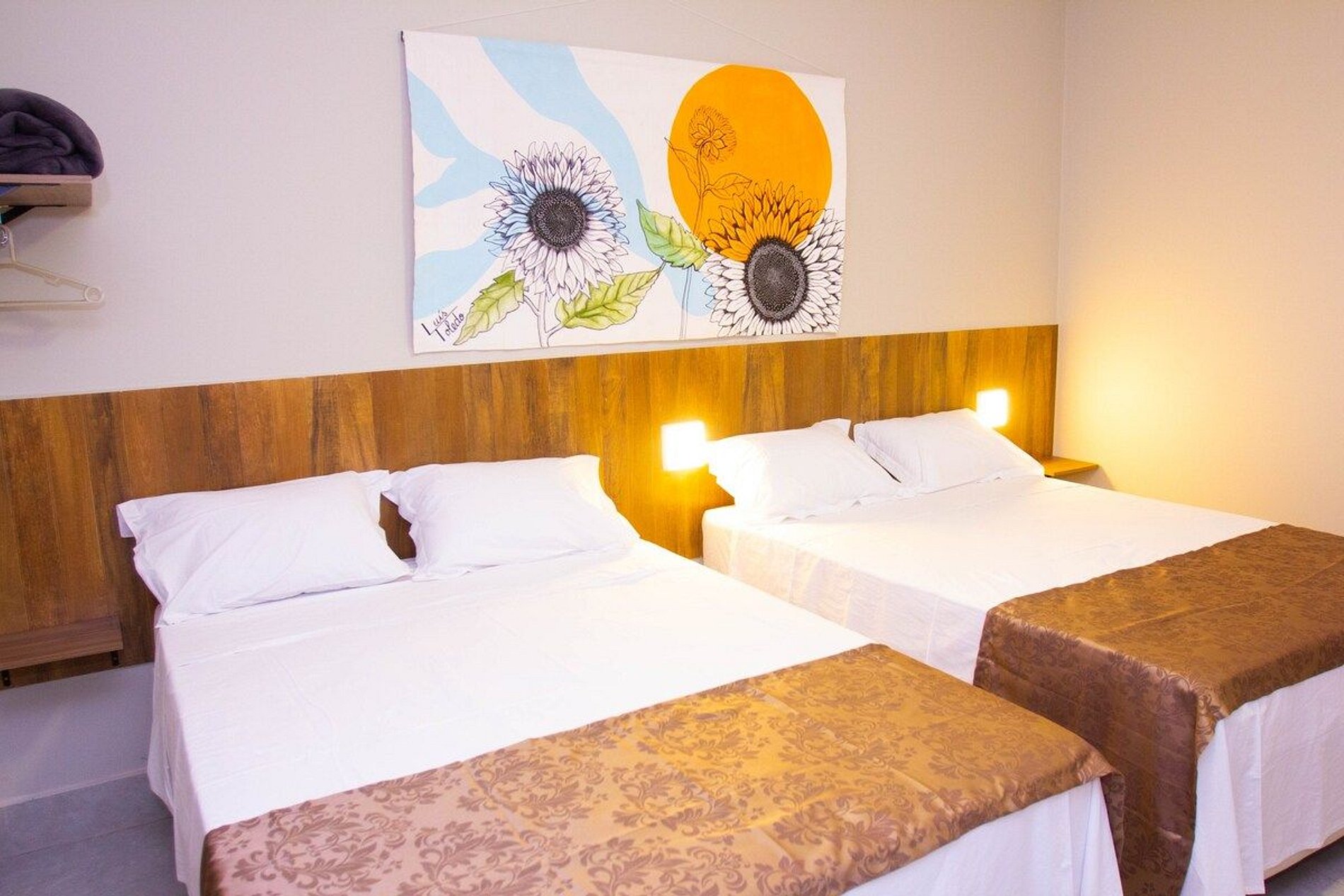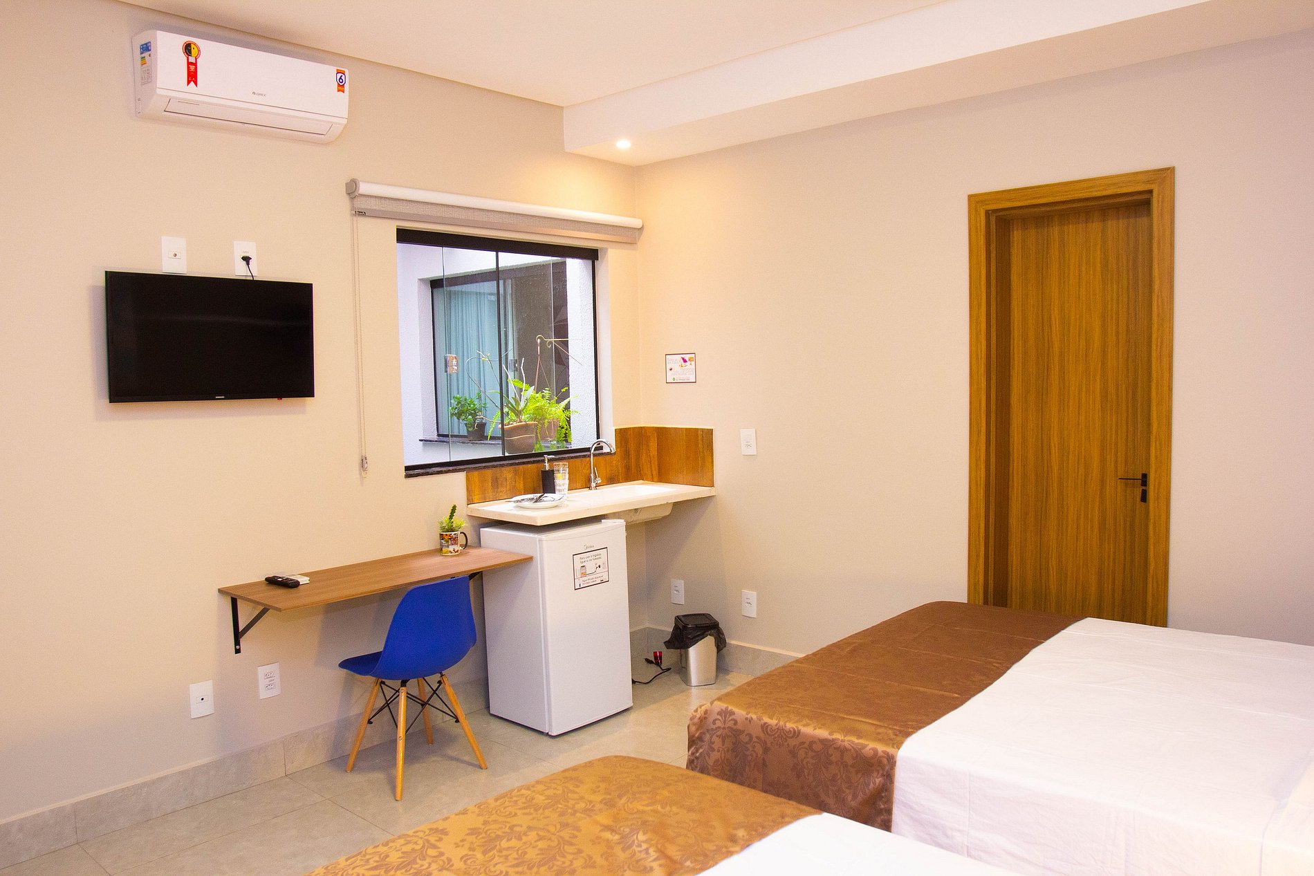 A suíte conta com duas camas de casal, frigobar, ar condicionado, smartTV. Disponibilizamos sabonetes, roupas de cama e banho por cortesia. O espaço é monitorado 24h por câmeras de segurança (áreas comuns) e Wi-fi.