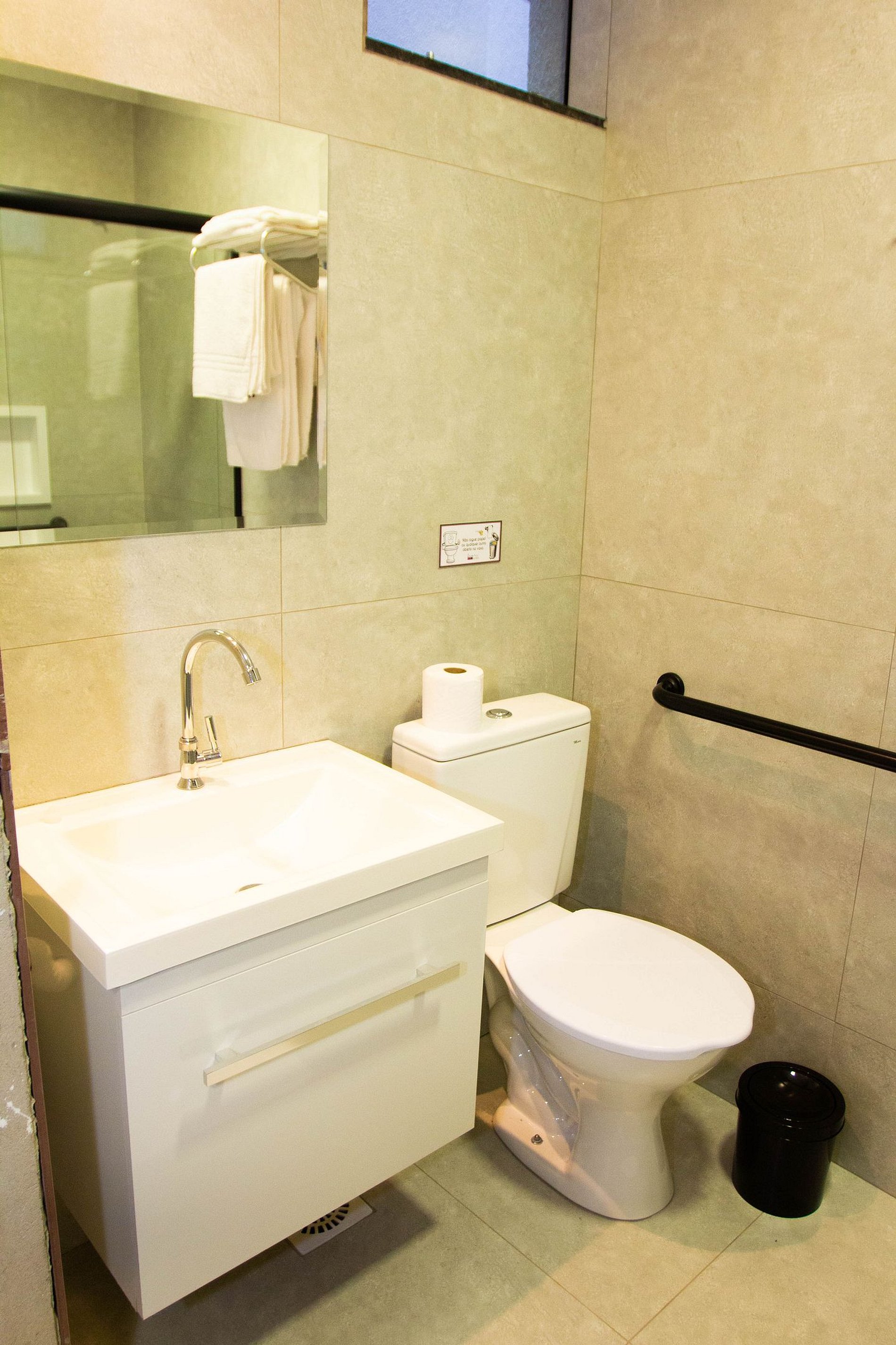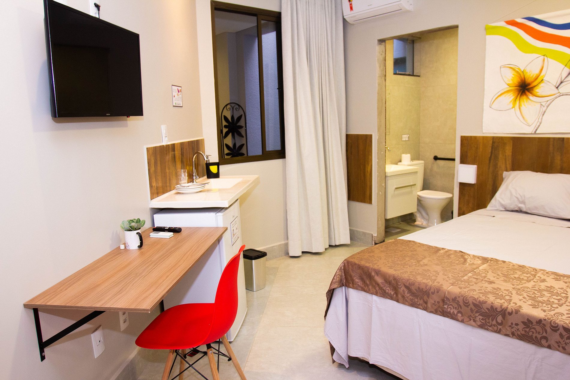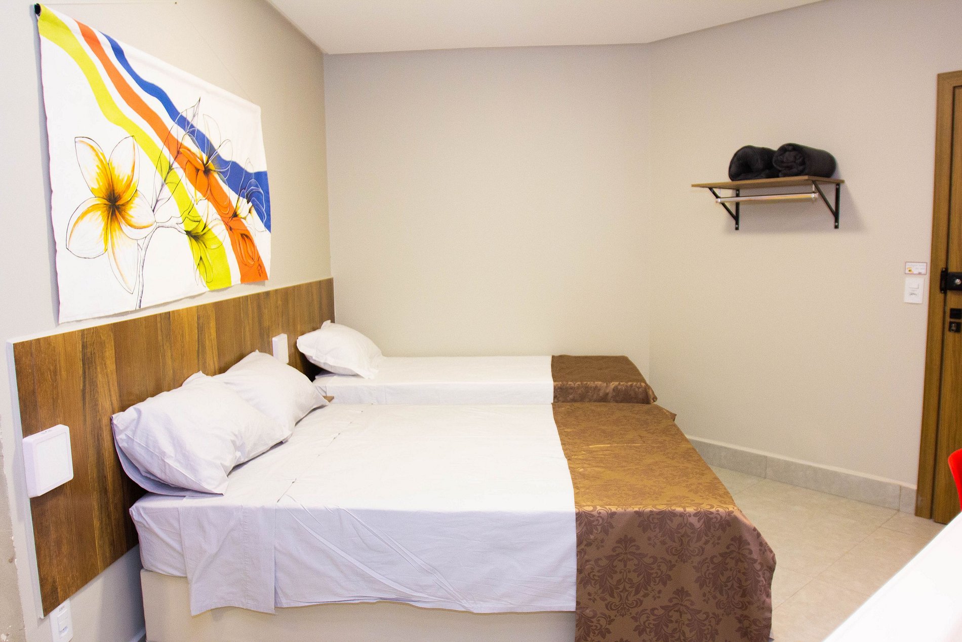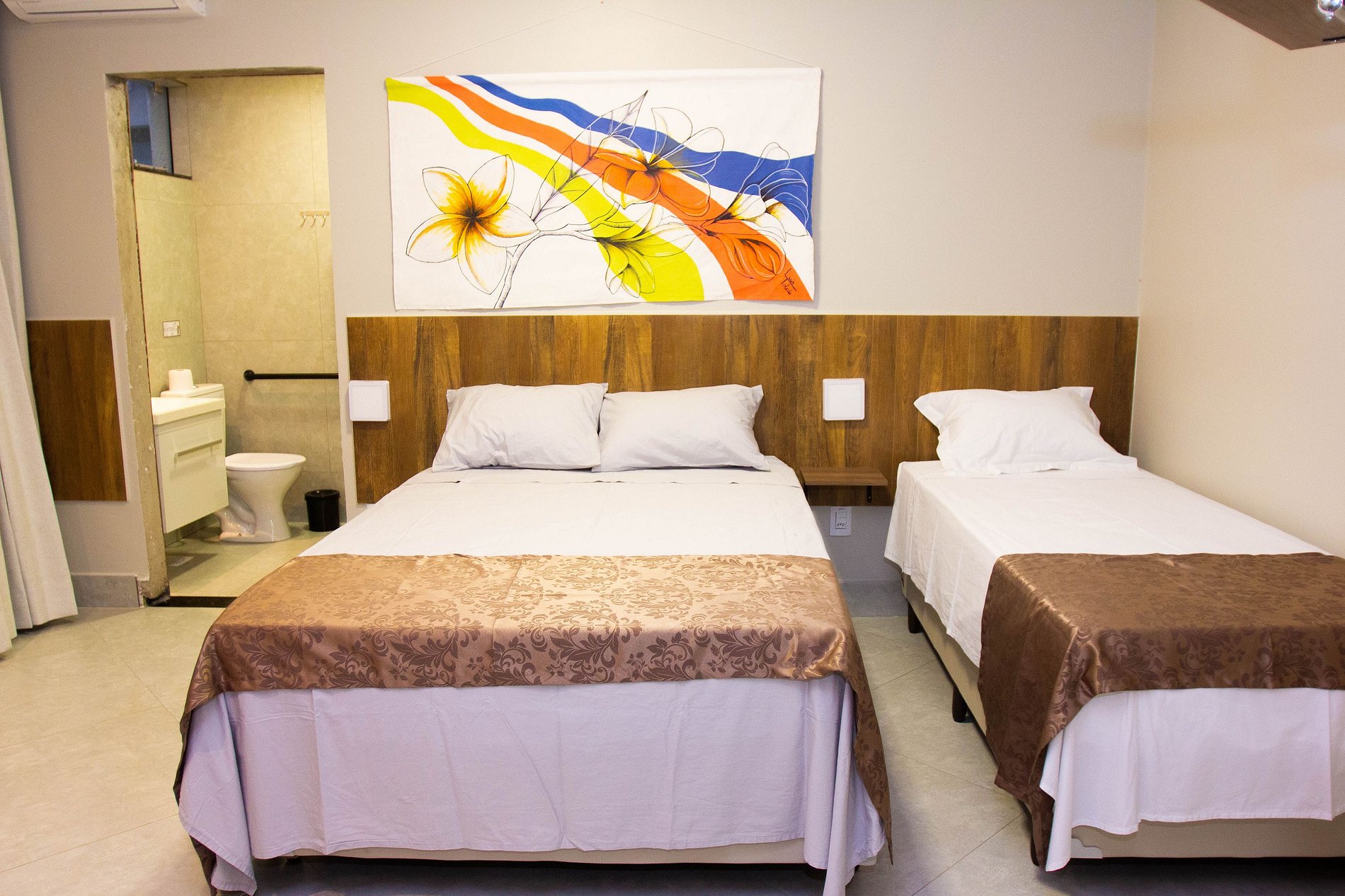 A suíte conta com uma cama de casal, uma cama de solteiro, frigobar, ar condicionado, smartTV. Disponibilizamos sabonetes, roupas de cama e banho por cortesia. O espaço é monitorado 24h por câmeras de segurança (áreas comuns) e Wi-fi.