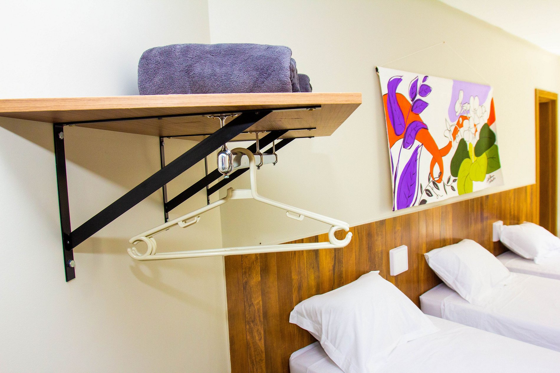 A suíte conta com duas camas de solteiro, frigobar, ar condicionado, smartTV. Disponibilizamos sabonetes, roupas de cama e banho por cortesia. O espaço é monitorado 24h por câmeras de segurança (áreas comuns) e Wi-fi.