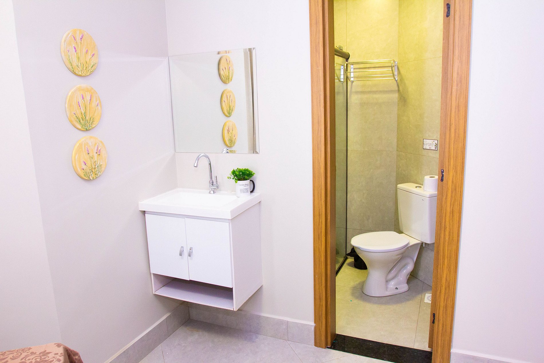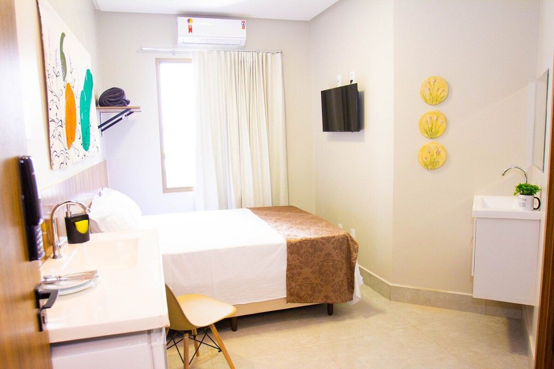 A suíte conta com uma cama de casal, frigobar, ar condicionado, smartTV. Disponibilizamos sabonetes, roupas de cama e banho por cortesia. O espaço é monitorado 24h por câmeras de segurança (áreas comuns) e Wi-fi.