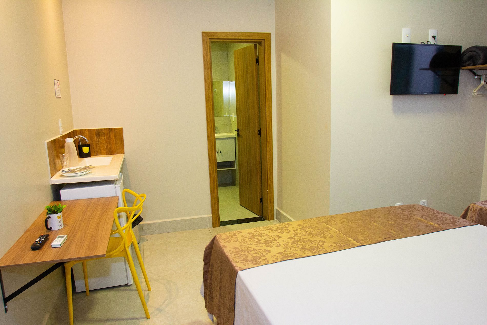 A suíte conta com uma cama queen size, frigobar, ar condicionado, smartTV. Disponibilizamos sabonetes, roupas de cama e banho por cortesia. O espaço é monitorado 24h por câmeras de segurança (áreas comuns) e Wi-fi.